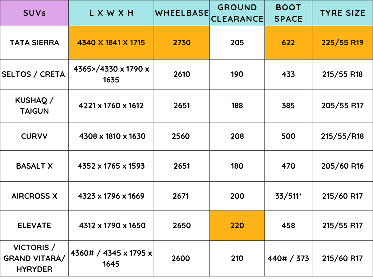 To create its own presence in an overcrowded SUV segment, Tata Motors had to do something unique with the new Sierra. So, the brand decided to make it the most spacious SUV in the segment. Below is the table of a detailed comparison of Sierra with all the other rivals.